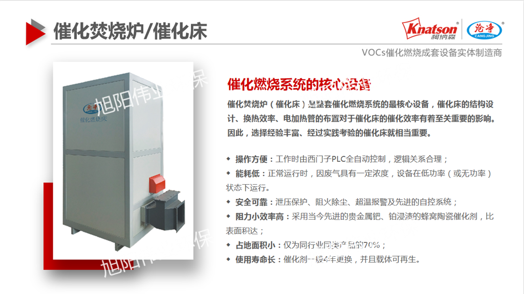 催化燃燒是用催化劑使廢氣中物質(zhì)在較低溫度下氧化的凈化方法。所以,催化燃燒又稱為催化化學(xué)轉(zhuǎn)化。由于催化劑加速了氧化的歷程,大多數(shù)碳?xì)浠衔镌?00~450℃的溫度時(shí),通過(guò)催化劑就可以氧化完全。與熱力燃燒法相比,催化燃燒所需的輔助燃料少,消耗低,設(shè)備設(shè)施的體積小。