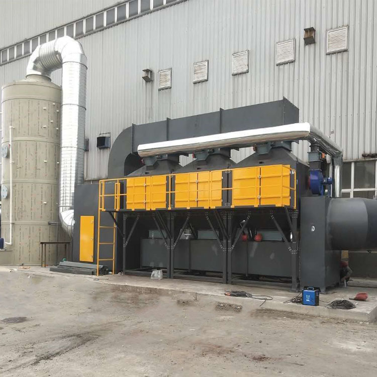 催化燃燒爐內(nèi)部的加熱系統(tǒng)對(duì)脫附氣體加熱產(chǎn)生高溫脫附氣體再通過活性炭床進(jìn)行脫附,脫附下的有機(jī)化合物由脫附風(fēng)機(jī)傳輸經(jīng)過換熱器進(jìn)行催化燃燒床燃燒,達(dá)標(biāo)后高空排放。